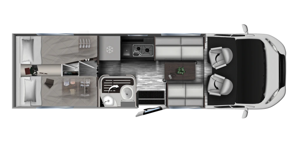 - Maximale Füllmengen: Frischwassertank während der Fahrt / Frischwassertank im geparkten Zustand / Abwassertank (L): 20 / 120 / 90